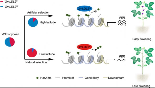 在自然選擇下,GmLDL2H1等位基因促進(jìn)大豆在低緯度地區(qū)適應(yīng);在人工選擇下,GmLDL2H2等位基因促進(jìn)大豆在高緯度地區(qū)適應(yīng)。GmLDL2通過(guò)改變GmFER基因位點(diǎn)上的H3K4甲基化狀態(tài)抑制GmFER表達(dá),進(jìn)而調(diào)控開花時(shí)間。