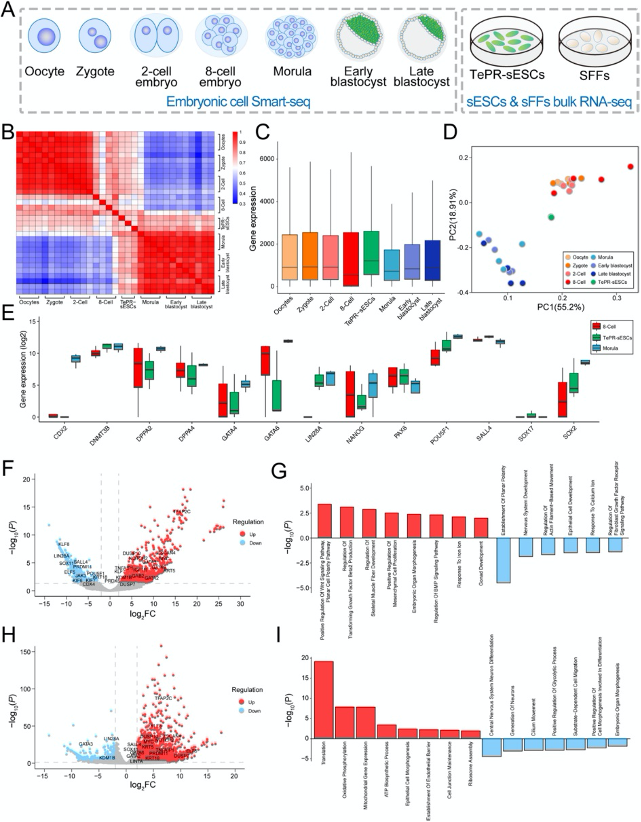 (C) 不同胚胎階段(MII卵母細胞、受精卵、2細胞期、8細胞期、桑椹胚、早期囊胚、晚期囊胚以及TePR-sESCs)的基因表達水平。