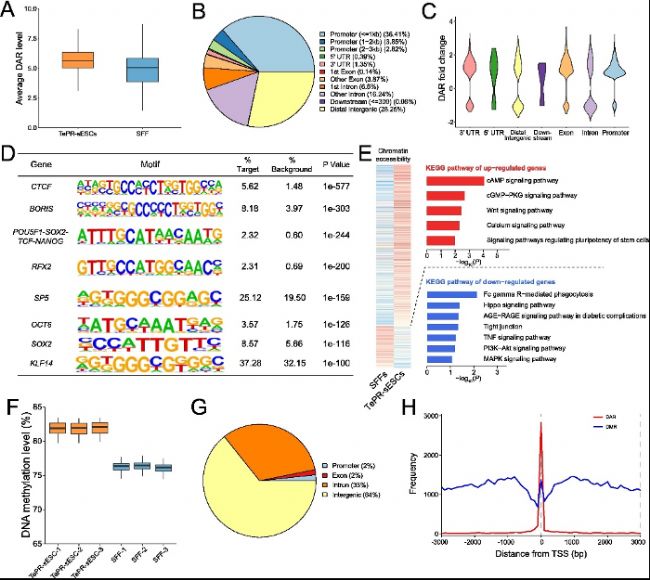 (G)TePR-sESC和SFF之間不同基因組區域(啟動子、外顯子、基因間和內含子區域)內DMR的分布。(H)轉錄起始位點的平均DNA甲基化水平和DAR分布(TSS±3Kb)。