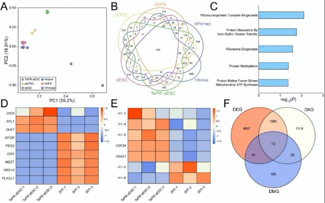 通過整合多組學(DEGs+DARs+DMGs)數據,研究團隊鑒定出13個在TePR-sESCs中具有特異性表達模式基因(如PDE4D、SIX6、MECOM和TBX18)。這些基因在cAMP、MAPK、細胞間連接和Ras信號通路中富集。此外研究者還分析了TePR-sESCs與其他物種(豬、牛)ESC的轉錄組數據,發現TePR-sESCs與人類naive ESCs的表達模式最為接近。這些結果揭示了TePR-sESCs特異性的基因網絡特征,為研究綿羊胚胎發育和ESC多能性提供了新視角。