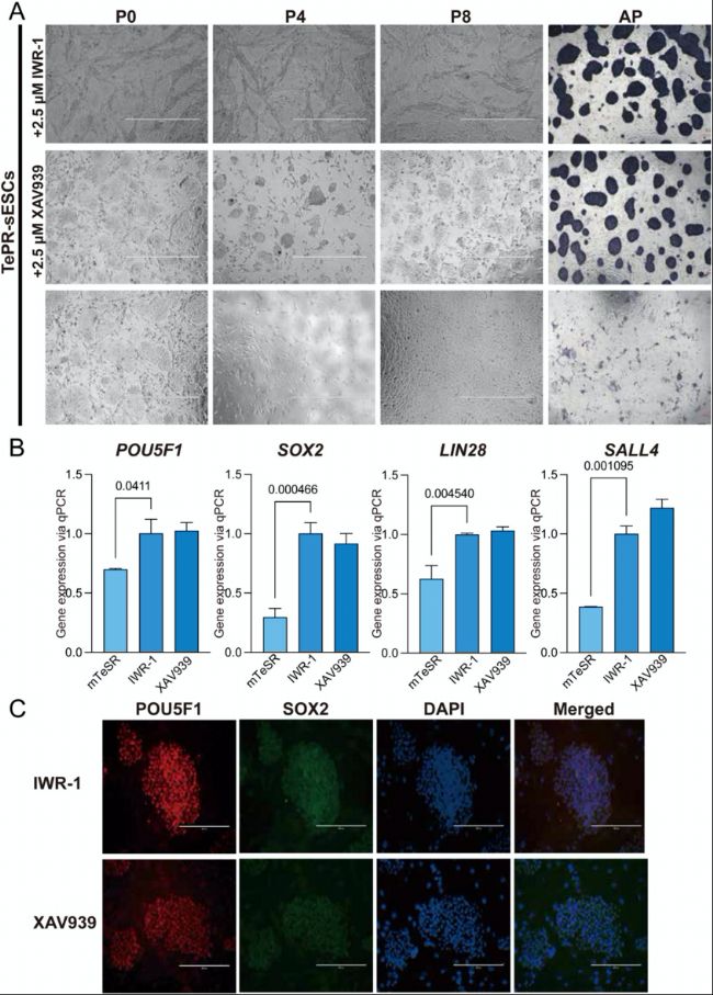 (A)比較IWR-1缺失和XAV939添加條件下培養的TePR-sESCs的形態與AP染色。