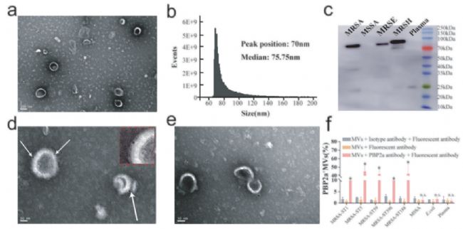 從不同克隆型 MRSA(包括ST5、ST398)、甲氧西林耐藥表皮葡萄球菌(MRSE)和溶血葡萄球菌(MRSH)的培養(yǎng)上清中提取 BEVs,并通過透射電鏡(TEM)確認(rèn)其典型雙層膜結(jié)構(gòu)(圖1a),NanoFCM 單顆粒分析顯示 BEVs 粒徑分布主要集中在 60-120 nm,峰值為 70 nm(圖1b),符合細(xì)菌來源 EVs 的典型特征。Western blot 結(jié)果顯示,MRSA、MRSE 以及 MRSH 來源 BEVs 中均有表達(dá) PBP2a 蛋白,而 MSSA 和血漿來源 EVs 中未檢測到 PBP2a 蛋白(圖1c);經(jīng)免疫電鏡進(jìn)一步確認(rèn) PBP2a 蛋白分布于 MRSA EVs 表面(圖1d, e)。最后,利用 NanoFCM 在單顆粒水平定量分析 PBP2a⁺ BEVs 的比例。結(jié)果顯示,MRS 來源的 EVs 中超過 40% 為 PBP2a 陽性,而 MSSA、大腸桿菌以及健康對照組幾乎檢測不到 PBP2a⁺ BEVs(圖1f)。這些結(jié)果證實 PBP2a 為 MRS 來源 EVs 的特異性標(biāo)志物。