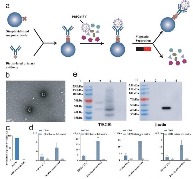 為了探究血漿中 PBP2a⁺ EVs 的來源,研究團(tuán)隊通過鏈霉親和素磁珠結(jié)合生物素化的 PBP2a 抗體,從 MRSA 血流感染患者血漿中捕獲 PBP2a⁺ EVs。經(jīng) TEM 觀測到完整的形態(tài)。同時,NanoFCM 結(jié)果顯示捕獲的 PBP2a⁺ EVs 純度超 90%(圖2c);進(jìn)一步利用 NanoFCM 檢測人源性的 EV 經(jīng)典標(biāo)志物,發(fā)現(xiàn) PBP2a⁺ EVs 表達(dá)經(jīng)典標(biāo)志物(CD63、CD81、CD9、CD11)的陽性率僅 3%-5%,顯著低于健康人血漿 EVs (7%-21%,圖2d);WB 也僅檢測出微量 TSG101(圖2e)。上述結(jié)果表明,MRSA 血流感染患者血漿中的 PBP2a⁺ EVs 主要來源于細(xì)菌,其特異性不受血漿中其他細(xì)胞來源影響,可作為 MRSA 感染的潛在標(biāo)志物。