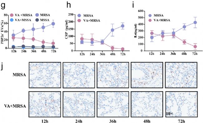 為深入探究抗生素治療 MRSA 期間血液中 PBP2a⁺ EVs 的動態(tài)變化。研究團(tuán)隊采用小鼠肺炎模型,隨機(jī)分為萬古霉素治療組和 PBS 對照組,在 MRSA 感染后 12-72 小時內(nèi)多次檢測血漿中 PBP2a⁺ EVs 的比例。結(jié)果顯示萬古霉素治療組的血漿 PBP2a⁺ EVs 比例呈現(xiàn)逐漸下降趨勢,72 h 時顯著低于 PBS 對照組(圖5g)。同時,治療組血漿中炎癥因子水平也明顯降低(圖5h, i)。此外,治療組肺組織中 Ly6G 陽性信號(中性粒細(xì)胞浸潤標(biāo)志)減少,提示肺部炎癥緩解,進(jìn)一步證實 PBP2a⁺ EVs 水平變化可準(zhǔn)確反映治療效果。