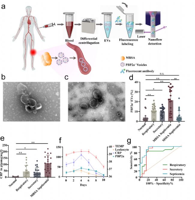 為了探究 PBP2a⁺ EVs 在人類感染中的臨床意義,研究團(tuán)隊收集健康對照者(n=20)以及 MRSA 感染患者(涵蓋呼吸道感染、組織/分泌物感染、血流感染 3 個部位,每部位 20 例),同時納入 20 例 MSSA 血流感染患者作為對照。免疫電鏡直接觀察到 MRSA 血流感染患者的血漿中存在 PBP2a⁺ EVs(圖6b, c);NanoFCM 定量顯示,所有 MRSA 感染患者血樣中 PBP2a⁺ EVs 比例均顯著高于健康對照組及 MSSA 對照組,且在血流感染患者中最高(圖6d)。進(jìn)一步分析發(fā)現(xiàn),MRSA 血流感染患者 CRP 水平顯著高于局部感染患者,且 CRP 水平與 PBP2a⁺ EVs 含量呈正相關(guān)(圖6e);在連續(xù)監(jiān)測中發(fā)現(xiàn),隨著感染緩解(體溫下降、CRP 及白細(xì)胞計數(shù)降低),PBP2a⁺ EVs 水平也逐漸降低(圖6f),其變化趨勢與臨床病情改善高度一致,可實時反映治療響應(yīng)。ROC 曲線分析表明,PBP2a⁺ EVs 診斷 MRSA 血流感染的 AUC 高達(dá) 0.9350,效能突出。此外,針對呼吸道感染(AUC=0.8025)和組織感染(AUC=0.8513)同樣具備可靠的診斷能力(圖6g),表明 PBP2a⁺ EVs 既能精準(zhǔn)識別血流感染這類重癥場景,也能覆蓋局部感染診斷需求,為不同部位 MRSA 感染提供統(tǒng)一高效的檢測指標(biāo)。