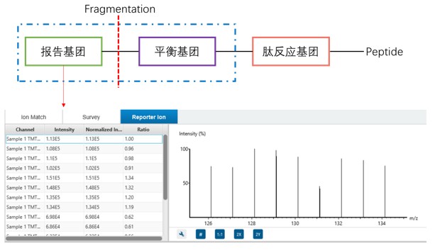 常用的基于MS2/MS3報告離子定量技術有TMT和iTRAQ。TMT和iTRAQ試劑均由報告基團、平衡基團和反應基團組成。反應基團可與蛋白質或肽段的特定基團(如賴氨酸殘基的氨基)發生共價結合,實現標記。標記后的不同樣本混合進行質譜分析。在MS1掃描時,由于標記后的肽段帶有相同質量的標簽,所以具有相同的質荷比,無法區分不同樣本來源的肽段。但在MS2掃描時,肽段發生碎裂,報告基團從標簽上脫落,產生具有特征質量的報告離子。不同樣本的報告離子質量不同,通過檢測這些報告離子的強度,就能計算出不同樣本中相應蛋白質的相對含量(圖6)。部分情況下,還可以進行TMT MS3掃描,進一步提高定量的準確性,減少干擾。