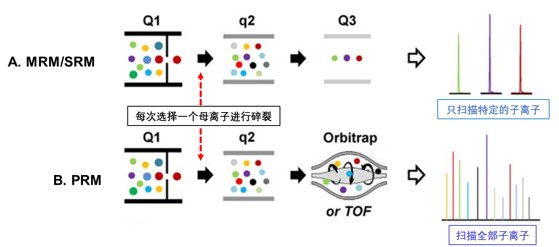 靶向定量是對預先設定的特定母離子進行定量分析,具有高靈敏度、高特異性和準確性的特點,是蛋白質組學研究中發現的潛在生物標志物驗證的重要方法。如圖8A所示,多重反應監測(MRM)及平行反應監測(PRM)是常用的靶向定量方法。在MRM模式下,儀器首先選擇目標肽段的母離子(特定質荷比的離子)進行檢測(Q1選擇),母離子在碰撞室中碎裂后,儀器再選擇特定的碎片離子(Q3選擇)進行監測。通過監測母離子到特定碎片離子的反應,能夠特異性地檢測目標肽段,排除其他干擾。PRM技術則是在MRM基礎上發展而來,它利用高分辨率質譜,能夠同時監測多個目標肽段的所有碎片離子,獲得更全面的信息,提高定量的準確性和可靠性(圖8B)。靶向定量需要預先了解目標肽段母離子的信息,如氨基酸序列、m/z等,通過針對性地優化檢測條件,實現對目標肽段和蛋白的精確定量。