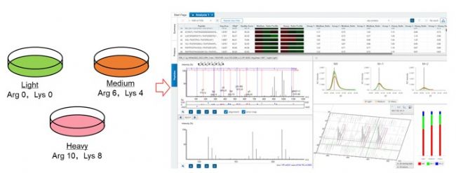 穩定同位素標記氨基酸在細胞培養中的應用(SILAC)是典型的基于MS1的代謝標記定量方法。在細胞培養過程中,向培養基中添加含有穩定同位素(如13C、15N等)標記的必需氨基酸(如精氨酸、賴氨酸)。細胞在生長代謝過程中,會將這些標記的氨基酸整合到新合成的蛋白質中。經過多代培養后,細胞內新合成的蛋白質幾乎都被穩定同位素標記。將標記細胞與未標記細胞(對照組)的蛋白質提取物混合,進行質譜分析。在MS1掃描時,由于標記和未標記蛋白質含有不同質量的氨基酸,它們的質荷比會出現差異,形成具有特定質量差的峰對。通過比較這些峰對的強度,就可以準確計算出標記樣本和未標記樣本中蛋白質的相對含量(圖7)。