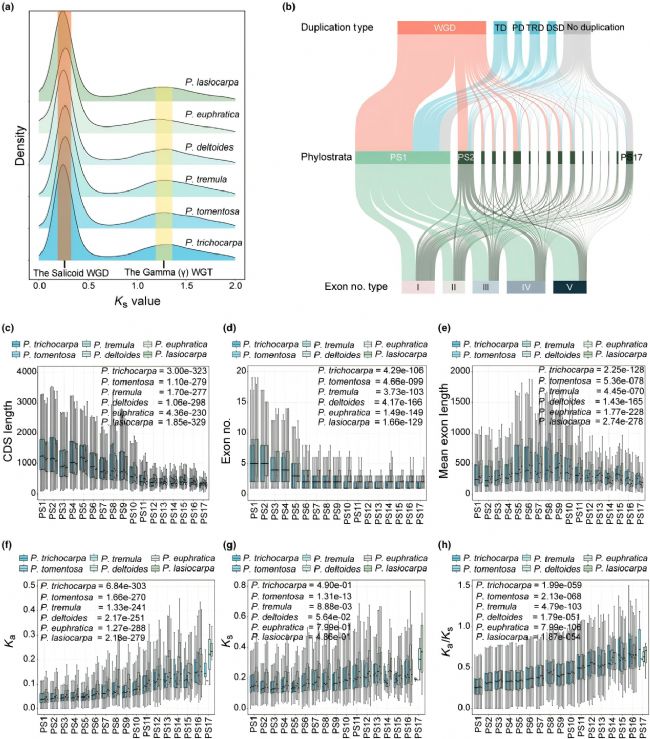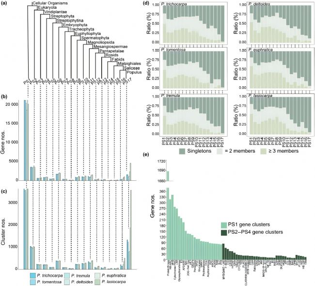 為了確定楊屬植物內基因的進化起源,作者對6個高質量測序的楊屬基因組進行了分析,6種楊屬基因組被分為17個系統發育層(PS1-PS17),PS1基因占比超51%,是基因組的主要成分。基因家族聚類分析顯示,PS1的基因家族發生了顯著擴張,表明這些古老基因的擴張可能塑造了楊樹進化的遺傳學基礎。