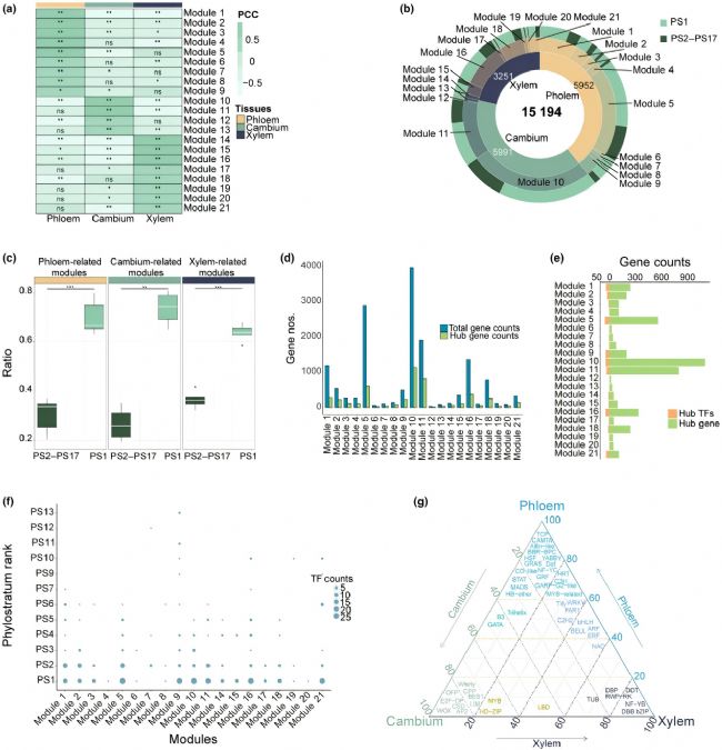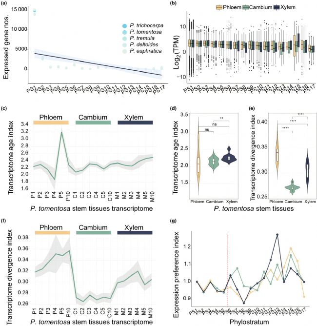通過對5種楊樹維管組織(韌皮部/形成層/木質部)進行轉錄組學分析,并計算TAI/TDI及表達偏好指數(EP),結果顯示PS1基因占表達基因的61.55%-66.38%,且在木質部、形成層、韌皮部中均呈現相似的表達水平,但轉錄分化程度差異顯著,且存在組織特異性表達模式。表明PS1基因的特異性表達驅動了楊樹次生維管系統轉錄調控網絡的差異形成。