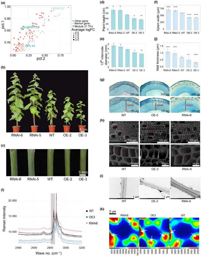 楊樹次生維管系統轉錄組與共表達網絡(WGCNA)分析顯示,劑量非限制性的PS1 ohnologues(MYB、NAC、WRKY 家族)在木質部存在特異性表達。通過對轉基因材料進行表型分析,結果顯示PtoWRKY53-OE 株系高度降低,莖直徑減少,木質部寬度減少;RNAi 株系則相反。電鏡觀察表明,PtoWRKY53-OE 株系纖維細胞壁變薄,纖維素含量降低;RNAi 株系則相反,證實PtoWRKY53抑制木質部次生壁沉積。