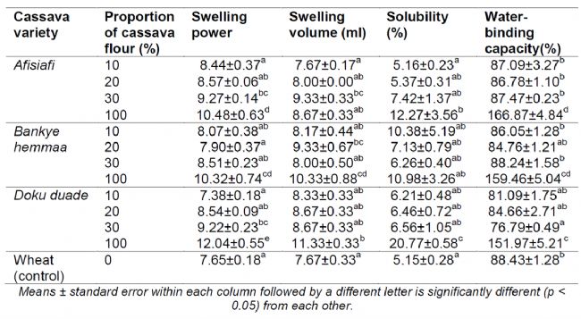 研究者對這些木薯粉和小麥粉的水分含量和水分活度、pH值和可滴定酸度、面粉的淀粉和直鏈淀粉含量、色澤、膨脹力、溶脹體積和溶解度指數、保水能力、糊化特性等逐一進行了測定。