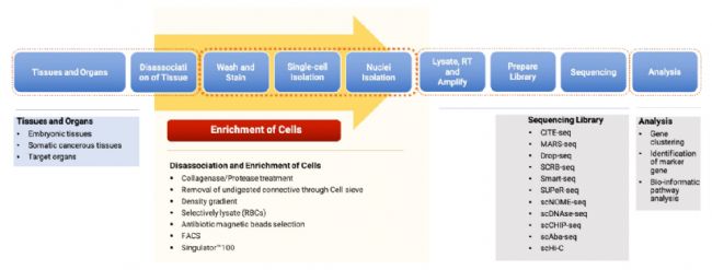 單細胞測序工作流程:1) 組織收集,2) 分離細胞制備,3) 測序文庫制備,4) 測序和 5) 分析。