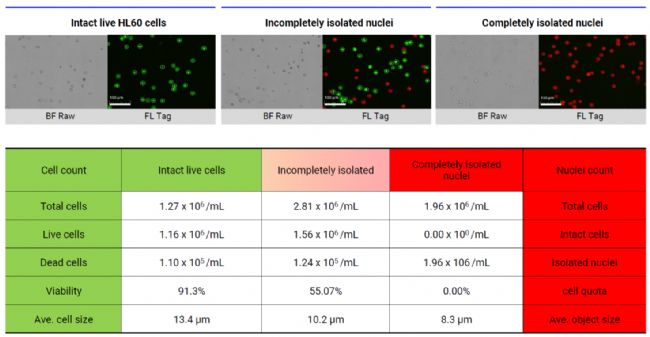 對于一些單細胞測序應用,分離的細胞需要進一步處理以產生分離且完整的細胞核。接下來我們評估了LUNA-FX7的實用性,以評估完全分離的細胞核的整體質量和數量。為此,我們使用了3種細胞系-HL60、HeLa細胞和HEK細胞。下圖顯示了包含完整健康HL60細胞(左)、細胞核部分分離的HL60細胞(中)和細胞核完全分離(右)的3幅圖像,并且具有完整細胞膜的活細胞通過AO染色后呈現綠色熒光。相比之下,死細胞和分離的細胞核都因通過缺損或缺失的細胞膜吸收PI而呈現紅色熒光。然而,LUNA-FX7允許您使用大小信息區分完整的死細胞和完整的細胞核。例如,完整活體的HL-60的平均細胞大小為13.4微米,完全分離的細胞核的平均大小為8.3微米,表明細胞膜和血漿部分被成功去除。未完全分離的核尺寸經測量平均為10.2 μm,表明分離核的質量不足以進行下游處理。