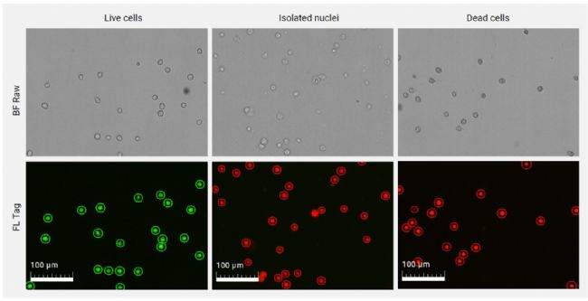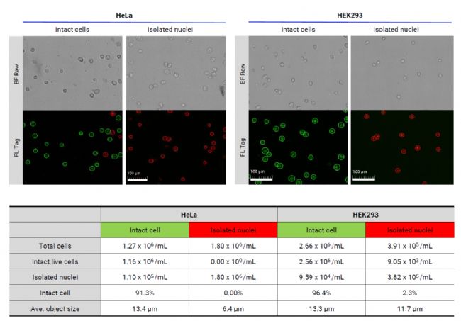 此外,LUNA-FX7的高分辨率明場圖像可用于目視驗證分離核的質量。例如,分離的細胞核可以很容易地與完整細胞區分開來,因為細胞核的邊界更薄,并且由于缺乏細胞膜而不明顯。