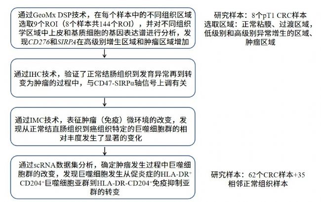 該研究聯合 DSP 空間組學、IMC 和單細胞數據分析技術,從空間生物學角度深入剖析 CRC 惡性轉化過程中的轉錄組與免疫學變化,不僅揭示了 CRC 發病和進展的生物學機制,還確定了與疾病進展密切關聯的生物標志物,以及有望應用于臨床免疫治療的潛在靶標 CD47-SIRPα。