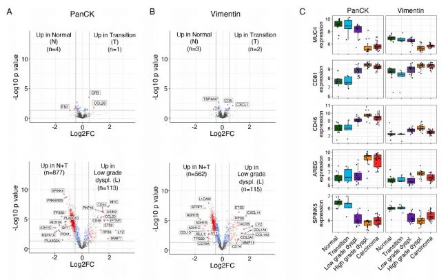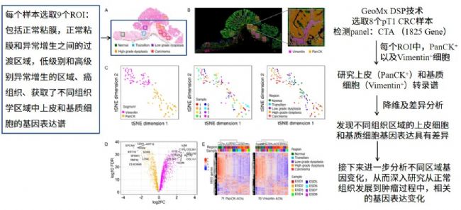 借助 DSP 空間多組學平臺,在相同樣本上圈選 9 個不同組織學 ROI 感興趣區域(選取每個 ROI 內 PanCK 和 Vimentin 陽性表達部分),分析上皮細胞(PanCK+)和基質細胞(Vimentin+)的轉錄變化。通過降維分析、差異基因分析等手段,發現不同組織區域的上皮細胞與基質細胞基因表達有差異。
