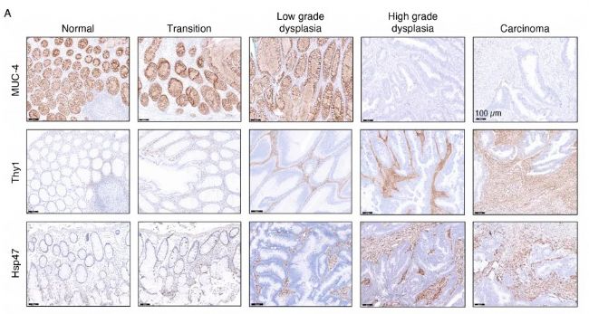 對不同區域轉錄組展開深入分析,篩選出多個在不同組織區域間表達差異顯著的基因,推測這些基因可能是早期 CRC 的理想生物標志物。下一步通過 IHC 驗證這些差異基因的表達變化是否與蛋白質豐度變化相符,以確認所選候選生物標志物(差異蛋白)可作為臨床生物標志物。