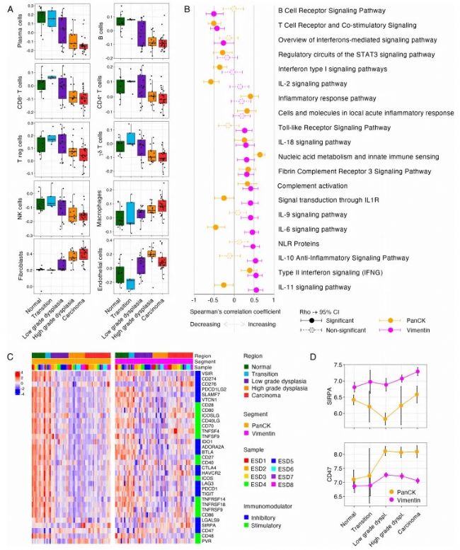 經富集分析篩選出大量免疫相關通路,接下來重點分析不同組織學區域間腫瘤(免疫)微環境的差異。利用免疫細胞反卷積算法計算各 ROI 內特定細胞亞群的相對豐度,結果表明從正常組織到癌組織,免疫細胞相對豐度呈下降趨勢,成纖維細胞、內皮細胞和巨噬細胞的相對豐度則升高。為更全面表征免疫微環境,進一步實施 WikiPathways 通路富集分析與差異基因分析,發現惡性轉化早期存在炎癥反應,CRC 發生時先天免疫反應被激活;同時,CD276(B7-H3)和 SIRPA(SIRPα)在高級別增生區域與癌區域的基質中表達增加。