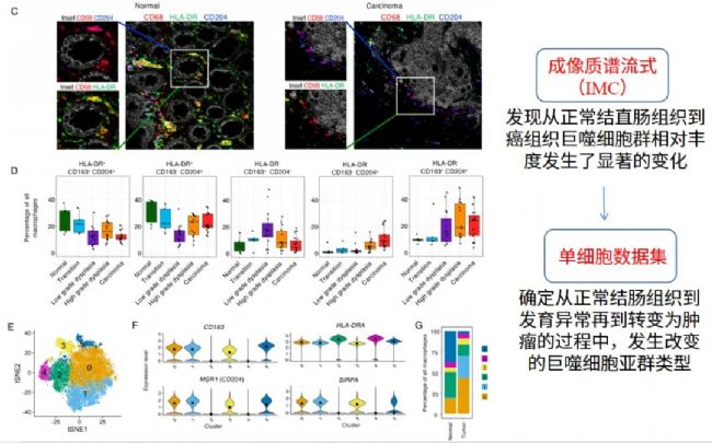 為更精準表征免疫微環境的改變,運用成像質譜流式(IMC)技術檢測,發現從正常結直腸組織到癌組織,特定巨噬細胞群(CD68、CD163、HLA-DR、CD204)的相對豐度有顯著變化。為明確巨噬細胞亞型,研究者采用前人已發表的單細胞數據集開展分析,結果顯示從正常結腸組織到發育異常再到腫瘤轉變過程中,髓系細胞浸潤增多,巨噬細胞發生從促炎癥性 HLA-DR+ CD204 + 亞型向 HLA-DR-CD204 + 免疫抑制亞型的轉變。