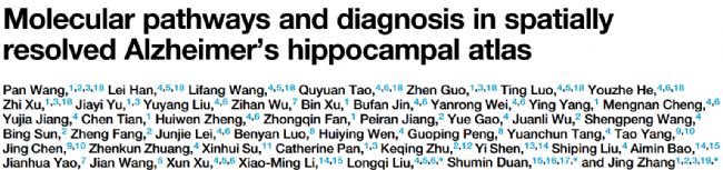 [1] Wang P , Han L , Wang L ,et al.Molecular pathways and diagnosis in spatially resolved Alzheimer's hippocampal atlas[J].Neuron, 2025, 113(13):2123-2140.e9.DOI:10.1016/j.neuron.2025.03.002.