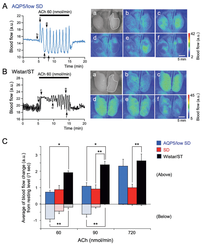- Wistar/ST 大鼠與 AQP5大鼠均存在 AQP5 低表達(dá),但低劑量 ACh 刺激時(shí)前者唾液分泌量顯著更高,核心原因是兩者頜下腺血流存在差異 ——Wistar/ST 大鼠低劑量 ACh 誘導(dǎo)的血流增加量約為 AQP5大鼠的 2 倍,且血流波動(dòng)未低于靜息水平。