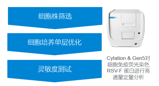該方法主要分為三個部分,包括細胞株篩選、細胞培養單層優化和方法學靈敏度測試,詳細介紹了基于 96 孔板 RSV-F 蛋白表達免疫熒光定量分析方案的有效性和靈敏度。