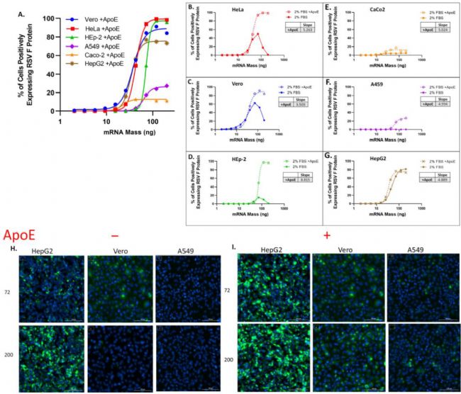 統計結果表明:其中 A549 細胞未顯示可檢測到的蛋白表達,而 Vero、HeLa、HEp-2 和 CaCo-2 中的 RSV-F 表達表現出明顯的鉤狀效應,在最高劑量下仍只能觀察到非常低的 RSV-F 表達,表明這些細胞系 ApoE 產生的有限而致使內吞能力較低。加入 ApoE 后能夠逆轉此現象(圖 A-G)。