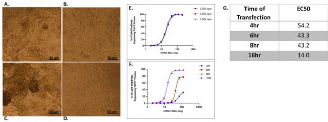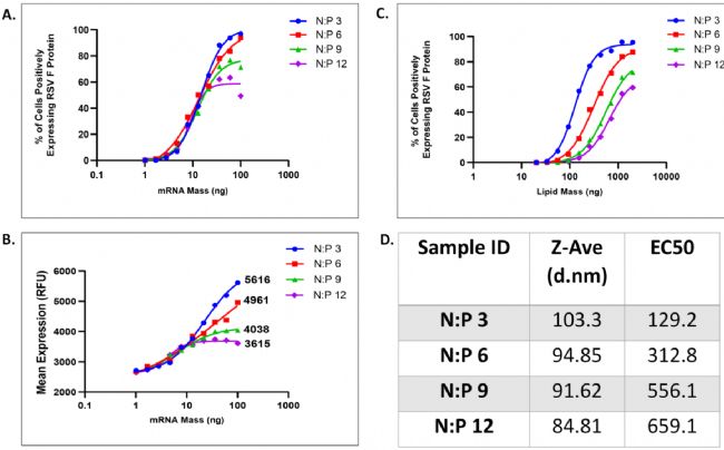 研究發現,而當 mRNA 量大于 10ng 時,由于內吞作用飽和、mRNA 量受限,細胞表達 RSV-F 的能力開始與 N/P 值呈反比,說明該方法對于 mRNA 表達是靈敏度良好 (圖 3AB) 并且可以用于監測 mRNA 的實時降解情況(圖 C)。