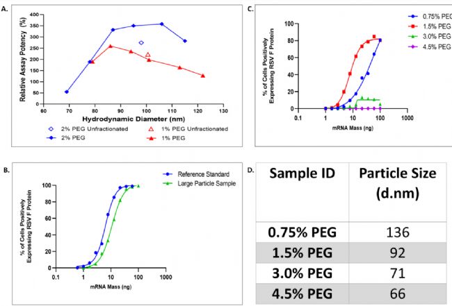 圖 4:對不同 LNP 尺寸和 PEG 占比樣本效價檢測靈敏度的驗證