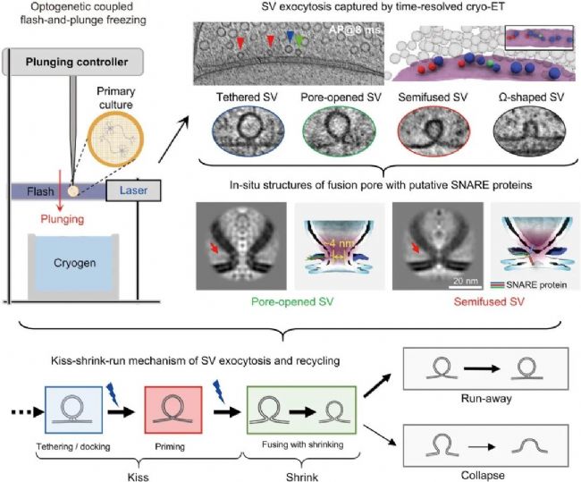研究發現在動作電位觸發后,大型囊泡經歷“拴留-半融合-開孔(tethered, semifused, pore-opened)”的“Kiss”階段,隨后通過約4納米脂質融合孔快速收縮為小型囊泡。約70毫秒時,收縮囊泡通過“run”實現快速回收,或完全塌陷融入突觸前膜。