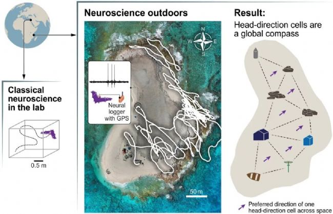 通過在坦桑尼亞桑給巴爾島對自由飛行的埃及果蝠進行無線神經記錄,發現頭方向細胞在廣闊地理范圍內保持穩定的方向調諧,支持“全局羅盤假說”而非“局部拼接假說”。研究證實這種神經羅盤不依賴天體(月亮/星辰)線索或地磁場,其方向編碼在數夜間逐漸穩定,表明環境空間學習的重要性。