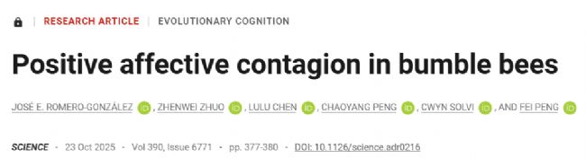 2025年10月23日,南方醫科大學彭飛教授團隊在Science期刊上發表了題名為“Positive affective contagion in bumble bees”的研究論文,本研究首次在社會性昆蟲熊蜂中證實了積極情緒傳染現象。