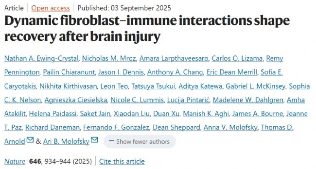 2025年9月3日,美國、澳大利亞以及法國的學者在Nature期刊上聯合發表了題名為“Dynamic fibroblast–immune interactions shape recovery after brain injury”的研究論文,研究系統闡明了腦損傷后成纖維細胞與免疫細胞的動態互作機制。