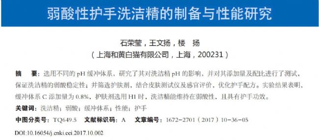 - 石榮瑩,王文揚,樓揚.弱酸性護手洗潔精的制備與性能研究[J].中國洗滌用品工業, 2017(10):5.DOI:CNKI:SUN:XDYP.0.2017-10-007.