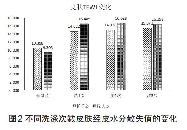 經皮水分流失值(TEWL)是評價皮膚屏障功能的重要指標,值越小說明屏障越完整。測試結果顯示,使用洗潔精后皮膚 TEWL 值均會上升,但弱酸性護手洗潔精組的 TEWL 值顯著低于對照組,意味著其對皮膚屏障的損傷更小,能減少手部水分散失,緩解干澀緊繃。