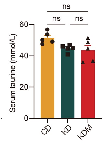 在這篇題為《Ketogenic diet-induced bile acids protect against obesity through reduced calorie absorption》的研究中(IF:18.9),牛磺酸含量檢測試劑盒用于定量檢測小鼠血清中的游離;撬崴剑▓D1),驗證生酮飲食(KD)或甲硫氨酸補(bǔ)充飲食(KDM)對血清游離牛磺酸含量的影響,進(jìn)而排除游離牛磺酸含量變化對牛磺酸結(jié)合膽汁酸(如 TDCA、TUDCA)循環(huán)的干擾。