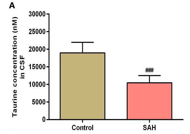 在這篇題為《Taurine attenuates neuronal ferroptosis by regulating GABAB/AKT/GSK3β/β-catenin pathway after subarachnoid hemorrhage》的研究中(IF:8.101),;撬岷繖z測試劑盒 用于定量分析人腦脊液(CSF)中的;撬釢舛龋茄芯康年P(guān)鍵起點(diǎn)之一。研究者發(fā)現(xiàn) SAH 患者腦脊液中的;撬崴斤@著低于對照組(圖2)。這一結(jié)果為后續(xù)研究提供了臨床依據(jù),說明;撬峥赡芘c SAH 后的神經(jīng)保護(hù)機(jī)制相關(guān)。