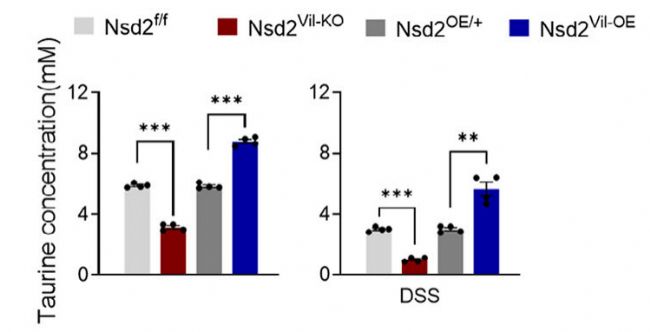 圖3 使用;撬嵛鍣z測試劑盒(n = 4)確定了Nsd 2Vil-KO和Nsd 2Vil-OE小鼠及其同窩小鼠(經(jīng)過或不經(jīng)過DSS處理)的內(nèi)膜異位癥中牛磺酸的水平[3]。