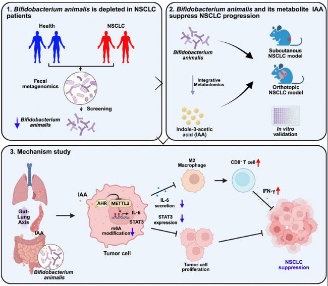 近年相關研究表明,腸道菌群及其代謝產物在NSCLC發生發展中具有重要作用。本研究發現,NSCLC患者與健康對照者的腸道菌群組成存在顯著差異,尤其動物雙歧桿菌(B. animalis)在NSCLC患者中顯著減少。B. animalis在兩種NSCLC小鼠模型和NSCLC細胞系中均能抑制腫瘤進展,研究整合代謝組學進一步揭示,吲哚-3-乙酸(IAA) 是B. animalis的關鍵代謝物,存在顯著抗NSCLC活性。具體而言,B. animalis及其IAA通過激活肺部芳香烴受體(AHR),抑制METTL3介導的STAT3 m6A甲基化;同時通過抑制IL-6減少M2型巨噬細胞極化并增強CD8+ T細胞功能,從而通過腸-肺軸調節抗腫瘤免疫。B. animalis與IAA的補充為NSCLC預防提供了潛在策略。