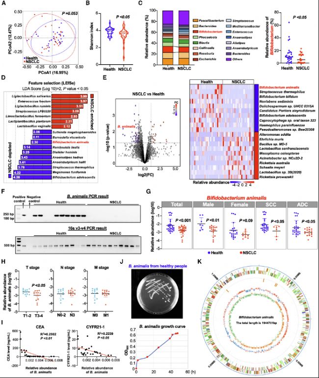 本研究通過宏基因組學分析發現,NSCLC患者腸道菌群多樣性降低,且B. animalis在患者組中顯著缺失。主坐標分析(PCoA)顯示患者與健康對照的微生物組成存在差異,而線性判別分析(LEfSe)進一步確認B. animalis是NSCLC相關的缺失菌種。通過PCR驗證,B. animalis在患者糞便中的豐度與腫瘤標志物(如CEA和CYFR21-1)呈負相關,提示其可能作為NSCLC的生物標志物。這一結果奠定了研究的基礎,表明腸道菌群失調與NSCLC發生相關。