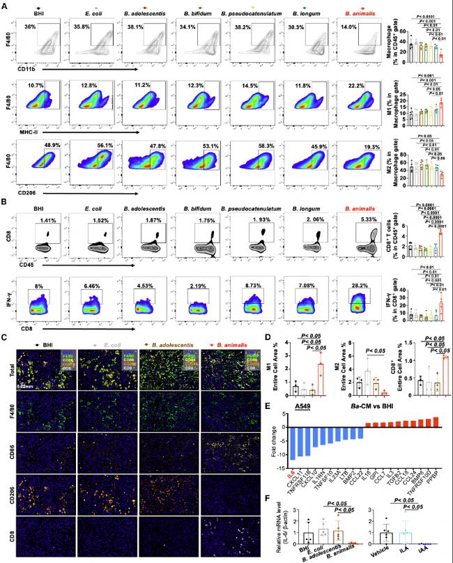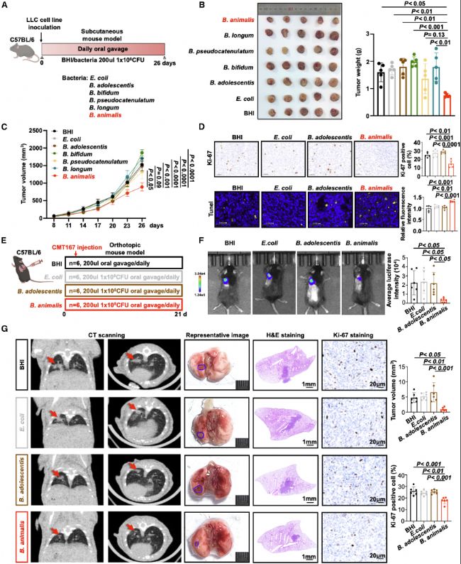 動物模型實驗:皮下接種LLC細胞的異種移植模型和原位注射CMT167-Luc細胞的原位模型,通過灌胃給予B. animalis或其代謝產物IAA,評估腫瘤體積、重量和免疫細胞浸潤。