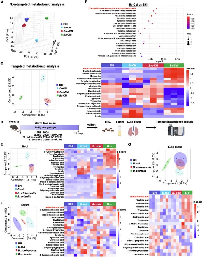 圖3:細菌上清液和無菌小鼠的代謝組分析鑒定出IAA是B.animalis的主要代謝物