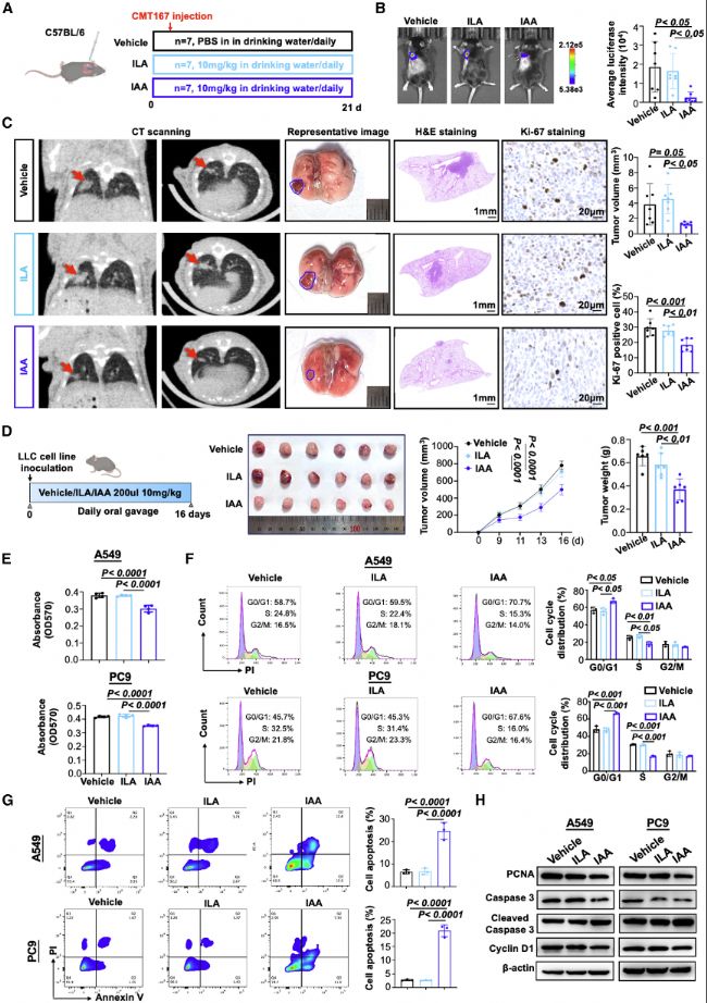 在CMT167原位和和皮下NSCLC小鼠模型中,IAA處理顯著抑制腫瘤生長,表現為腫瘤熒光強度減弱和腫瘤體積縮小。體外實驗也證實IAA能抑制NSCLC細胞的增殖,促進細胞周期阻滯和凋亡,并下調增殖相關蛋白(如PCNA和cyclin D1)的表達。這些結果驗證了IAA能復制B. animalis的抗腫瘤作用,強調了代謝物在機制中的核心地位。