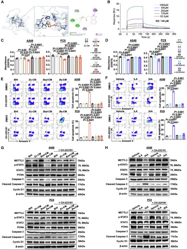 分子對接和SPR實驗證實IAA能與AHR受體結合。HR抑制劑CH-223191部分抵消了B. animalis和IAA的抗腫瘤效果。Western blot分析顯示,AHR抑制后,METTL3、STAT3和p-STAT3表達恢復,證實了AHR/METTL3/STAT3軸通路。這一結果將微生物信號與宿主表觀遺傳調控聯系起來,突出了IAA-AHR互作的中心角色。