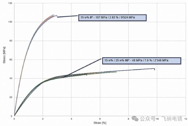 采用 DIN 527-1 標(biāo)準(zhǔn)制備 0° 與 90° 取向的試樣,在室溫下進(jìn)行準(zhǔn)靜態(tài)拉伸測(cè)試。
