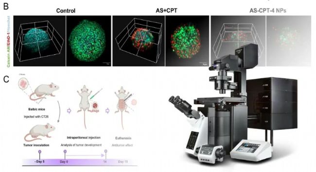 值得提到的是該研究中AS-CPT-4 NPs對結(jié)腸癌腫瘤球的殺傷作用數(shù)據(jù)獲取得到了成都中醫(yī)藥大學藥學院中心平臺孫晨老師的技術支持。該平臺全新購置的的奧偉登(Evident)FV4000激光掃描共聚焦配備全新的高靈敏硅基半導體檢測器SilVIR,具有更高的靈敏度和更大的動態(tài)范圍,從而可允許采用較低的激光強度即可獲得高信噪比圖像,大大降低了激光毒性。同時FV4000具有超高的掃描速度,大大提高了多色3D腫瘤球數(shù)據(jù)獲取的效率。奧偉登(Evident)FV4000多色全光譜型定量共聚焦顯微鏡已在生命科學領域內(nèi)得到了廣泛的認可與應用,展現(xiàn)出其在生物成像方面的非凡魅力與卓越表現(xiàn)。