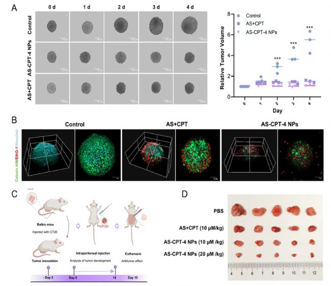 在成功構(gòu)建AS-CPT-4 NPs后,團隊利用腫瘤球探究了AS-CPT-4 NPs的抗結(jié)腸癌活性,除腫瘤球生長曲線外,利用激光共聚焦顯微鏡探究了AS-CPT-4 NPs對結(jié)腸癌腫瘤球的殺傷作用。結(jié)果顯示未經(jīng)處理的腫瘤球維持了良好的活性,而AS-CPT-4納米顆粒和AS組合CPT處理誘導了不同程度的細胞死亡,其中AS-CPT-4納米顆粒表現(xiàn)出更強的細胞毒性。AS-CPT-4 NPs在體內(nèi)結(jié)腸癌小鼠模型中同樣展現(xiàn)出強大的抗腫瘤作用,實現(xiàn)了79.86%的腫瘤生長抑制率。此外,AS-CPT-4納NPs的腫瘤體積增長曲線更平緩,表明AS-CPT-4納米顆粒能夠有效抑制腫瘤生長。
