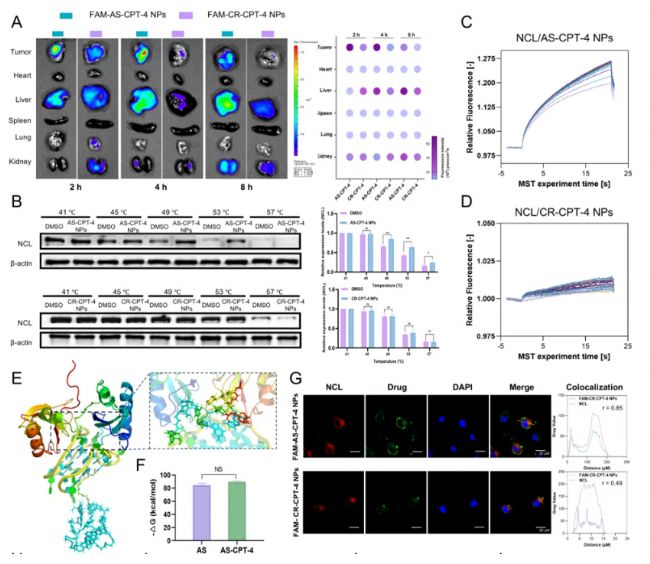 團隊利用MST,CETSA,及AS-CPT-4 NPs與NCL共定位實驗證明AS1411與CPT偶聯(lián)后沒有影響AS1411對于NCL的靶向性,表明AS-CPT-4 NPs具有良好的腫瘤靶向性。