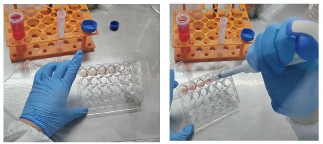 5、輕輕搖動含有誘導細胞懸液的離心管,將PSC以每孔2.5×105 - 3×105的細胞加入包被的6孔板中。例如,如果PSC懸液中的細胞團濃度為1×106個/mL,則在每孔中加入0.25-0.3mL的誘導培養基。